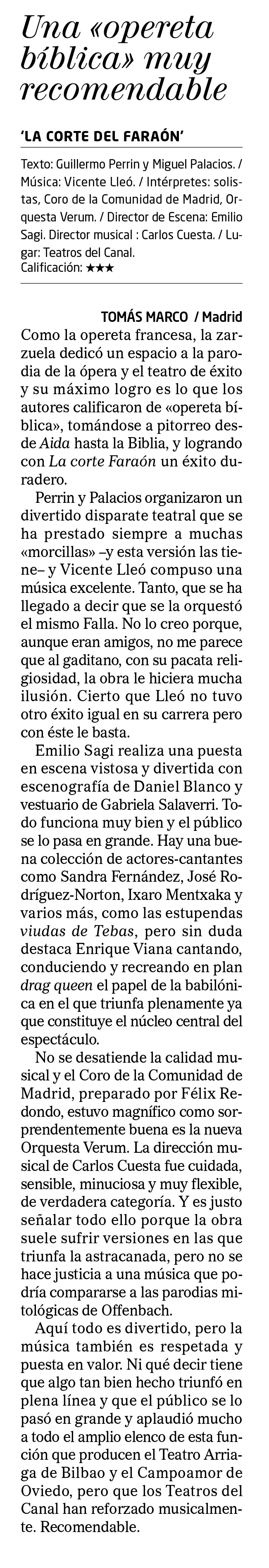 “(...) pero sin duda destaca Enrique Viana cantando, conduciendo y recreando en plan drag queen el papel de la babilónica en el que triunfa plenamente ya que constituye el núcleo central del espectáculo.”
